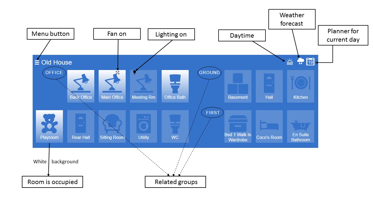 You will be directed to the Home Page, which shows access icons for all the Zones (rooms) in the house, along with basic information about their status. These have been collated into related groups (e.g. Ground floor, Outside etc).