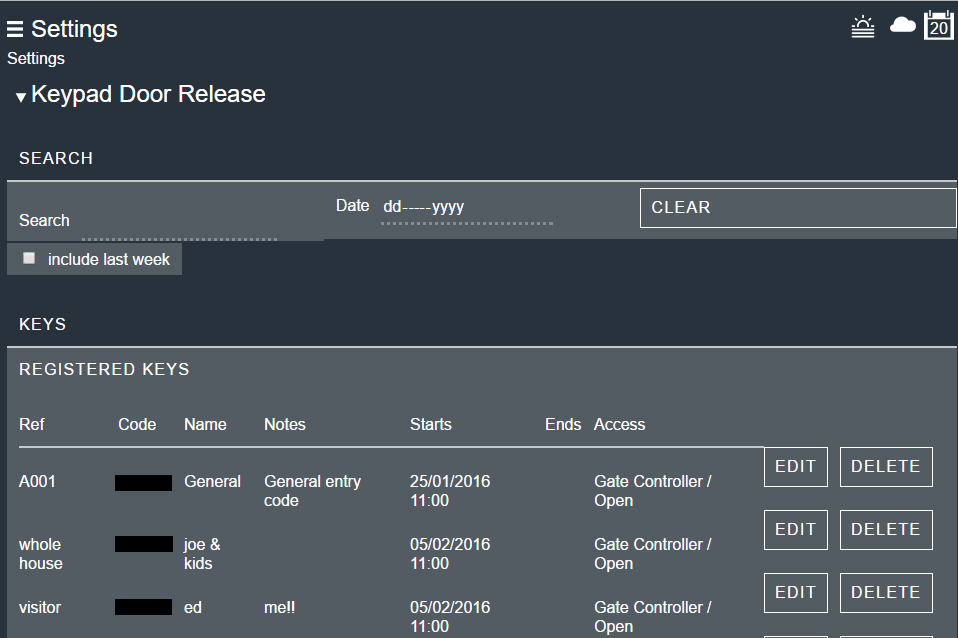 - You can add an unlimited number of keypads, for different members of the family or visitors. If needed, set up a start and end date when the code is active and in case of multiple access points, chose the ones you want to grant access to.